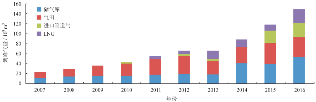 天然气调峰设施建设落后于市场发展,天然气调峰保供体系尚待完善。天然气调峰设施一般指地下储气库、LNG(接收)调峰站和储气球罐等,气田和管道具有重要的调峰作用,但一般列入天然气调峰设施体系中。