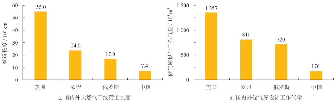 图1 国内外天然气管线长度和储气库规模对比图